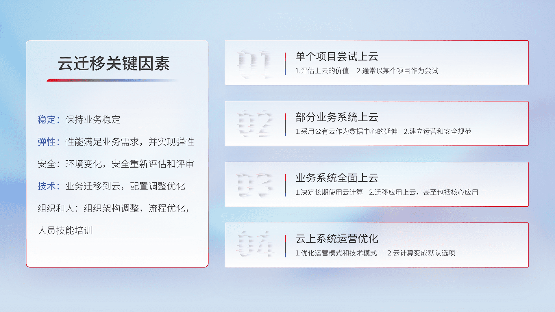 结合实际业务,,,,从规划设计、、、、云平台选型、、云原生改造、、、数据迁移、、、集成交付,,迁移全过程为客户识别最佳上云路径,,,做好风险识别管理,,,,设计网络架构、、、、身份权限、、、安全审计合规、、、操作审计、、、、日志审计、、监控告警策略、、多站点容灾设计等,,对云上基础设施进行整体规划,,提升IT治理水平,,,以满足弹性、、高可用、、、高性能的需求。。。
